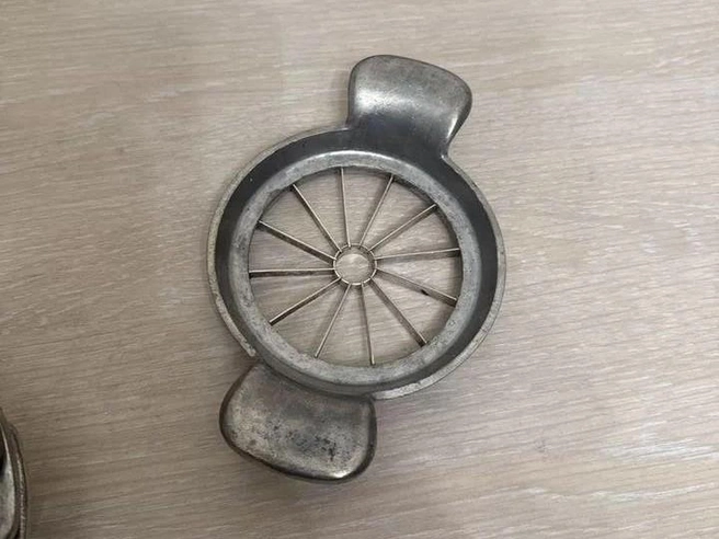 На фото изображена яблокорезка. Это специальный предмет кухонной утвари, облегчавший работу домохозяйкам. С его помощью можно было быстро удалить у яблока сердцевину с косточками и нарезать фрукт на равные дольки.